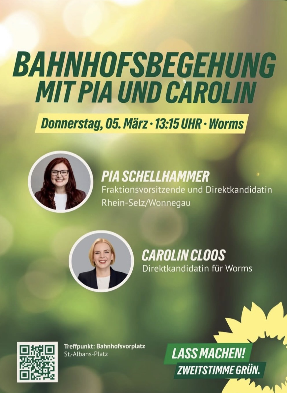 Die Wormser Direktkandidatin Carolin Cloos und Pia Schellhammer, Kandidatin auf Listenplatz 2 von BÜNDNIS 90/DIE GRÜNEN RLP, und der Kreisverband von BÜNDNIS 90/DIE GRÜNEN Worms laden zur Bahnhofsbegehung ein. Im Mittelpunkt steht der Austausch über die Potenziale und Entwicklungsmöglichkeiten des Hauptbahnhofs Worms, etwa in Bezug auf bessere Anbindung, Aufenthaltsqualität und Barrierefreiheit. Die Bahnhofsbegehung beginnt um 13:15 Uhr am Treffpunkt Bahnhofsvorplatz – St.Albans Platz.